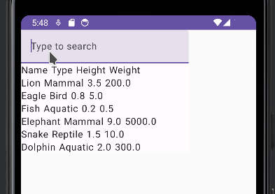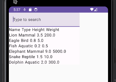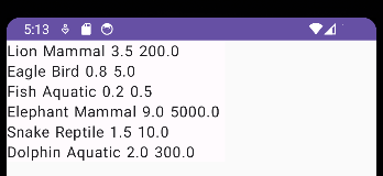 Animal(name = "Snake", type = "Reptile", height = 1.5, weight = 10.0),