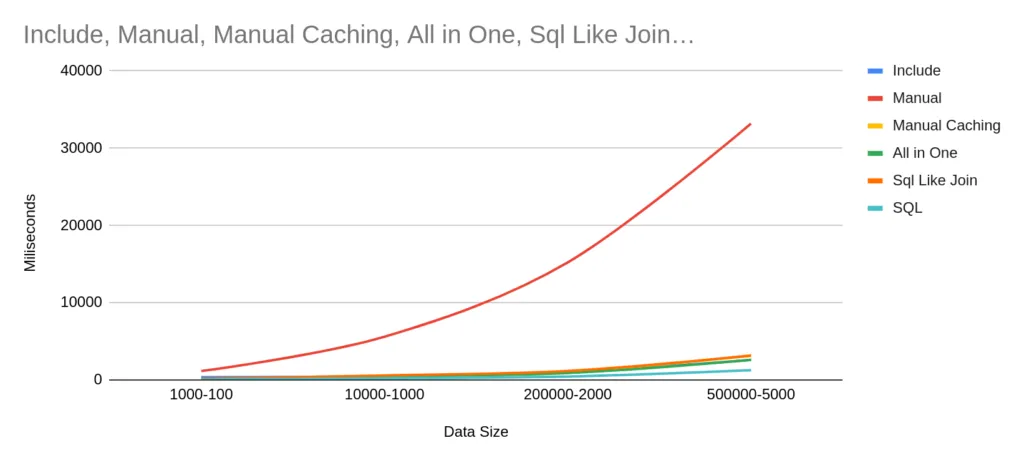 The SQL approach is the best option when performance is a priority. However, in many cases, we don’t want SQL strings in our code, so the next best options are the All-in-One or Include approaches. The Include approach is easy to use and offers good performance. Manual Caching and All-in-One are also good options, though they have slower performance.
